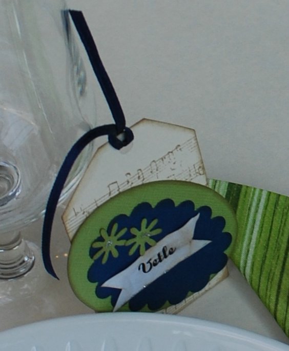 Ark fra Pion, bak bildet egenstemplet på gråpapir, blondeblomst, blonde nederst er svertet for å få riktig farge, laget tag og teksten er svertet bokstaver og så tatt av. Ikke helt planlagt, men bokstavene hadde feil farge, så jeg pirket dem av... fikk unektelig en artig effekt!! :-). Sløyfen er glimmermistet og krøllet og fjøra er svertet for å dempe grønnfargen. Ser ar det er flere som bruker fjør til pynt, og syntes det var så festelig.